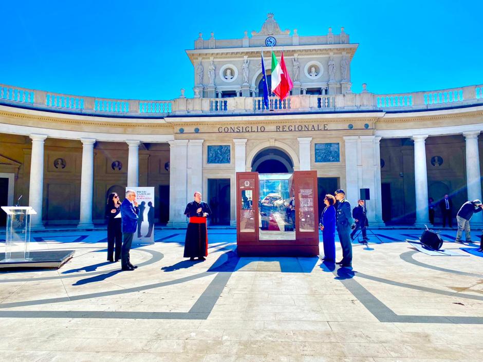 Alcune emozioni della Cerimonia di disvelamento all’Emiciclo del Consiglio Regionale D’Abruzzo L’Aquila, della teca con i resti dell’auto di scorta di Giovanni Falcone esplosa a Capaci il 23 maggio del 1992